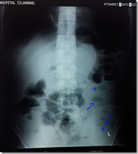Intestinal perforation, on the other hand, is an emergency and it usually needs surgical intervention. in the image below, on the left side you see an erect abdominal X-ray and on the right-hand side, you see a chest X-Ray that shows intestinal perforation.The X-ray finding in case of intestinal obstruction is “air under diaphragm”. Air looks blackish in the X-Ray film. The arrows in both the X-Rays show air under the diaphragm. In the chest X-ray, it can be noticed easily that the blackish lungs and blackish air under the diaphragm are separated from each other by a thin whitish ridge of the diaphragm.